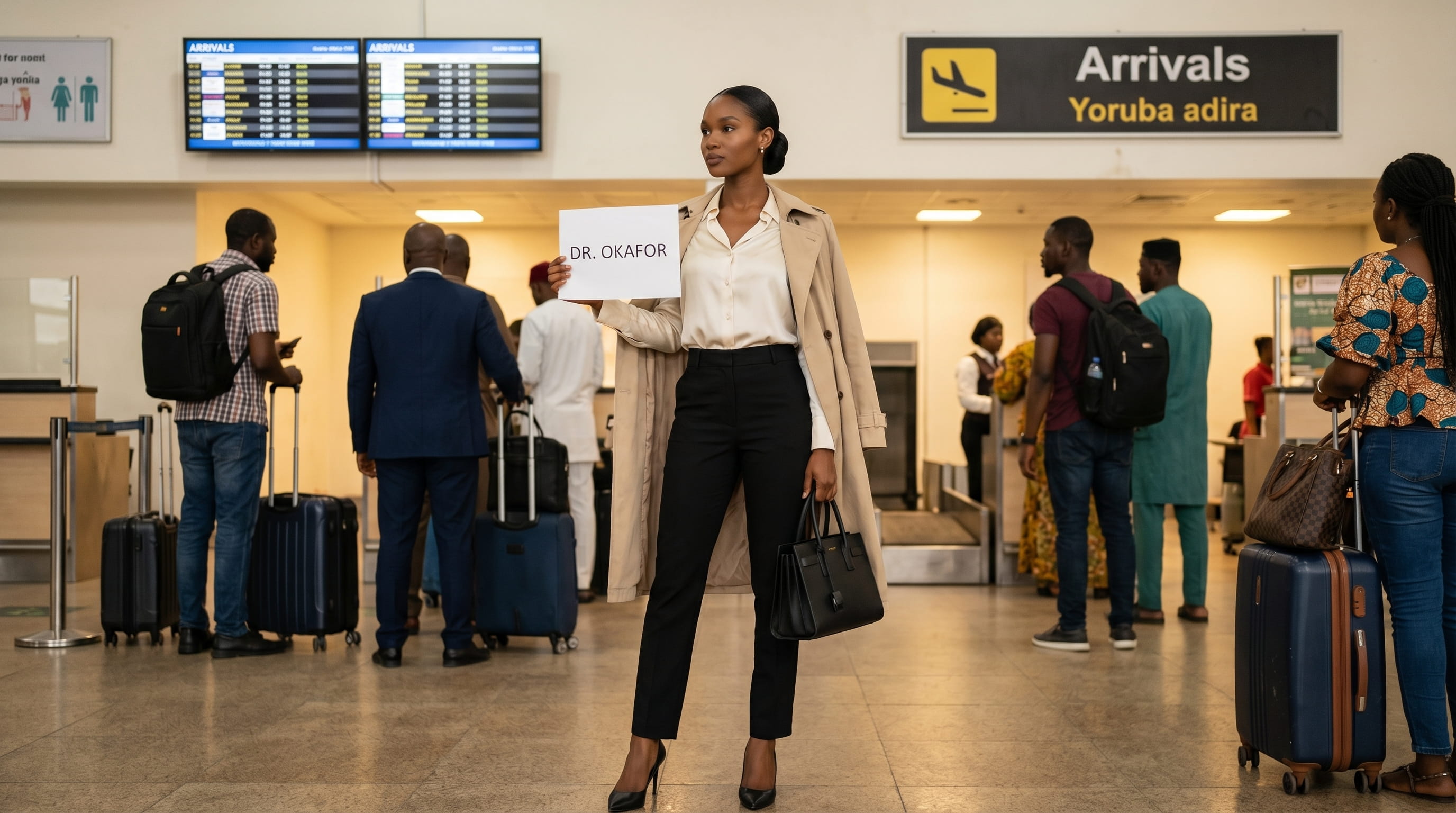 She had made it the night before, slightly embarrassed by herself, slightly not. White card, black marker, his name in capital letters: DR. OKAFOR. She thought it would make him laugh. She thought the formality of it — the official acknowledgment of everything the eleven years had produced, the title, the achievement, the reason for all of it — would be the right note to strike when he came through those doors. She had practised holding it. She had stood in her living room at ten PM with the sign at chest height and smiled at the wall and told herself not to cry at the airport because her mascara was new.